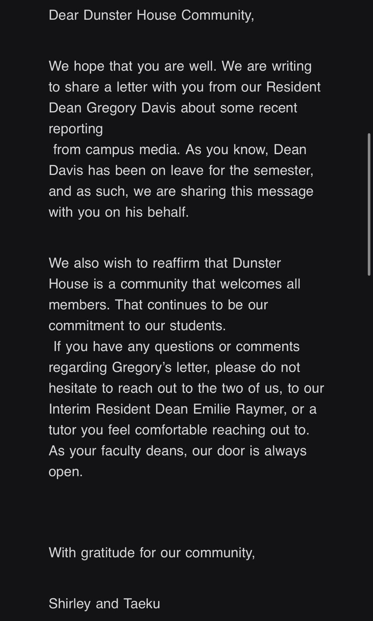 Today, I wrote a piece in The Harvard Salient about incendiary comments made by Harvard’s Resident Dean of Dunster House, Gregory Davis. Since publication, Davis has both deleted his Instagram account and has issued a half-hearted, non-apology to the “Dunster House Community.”