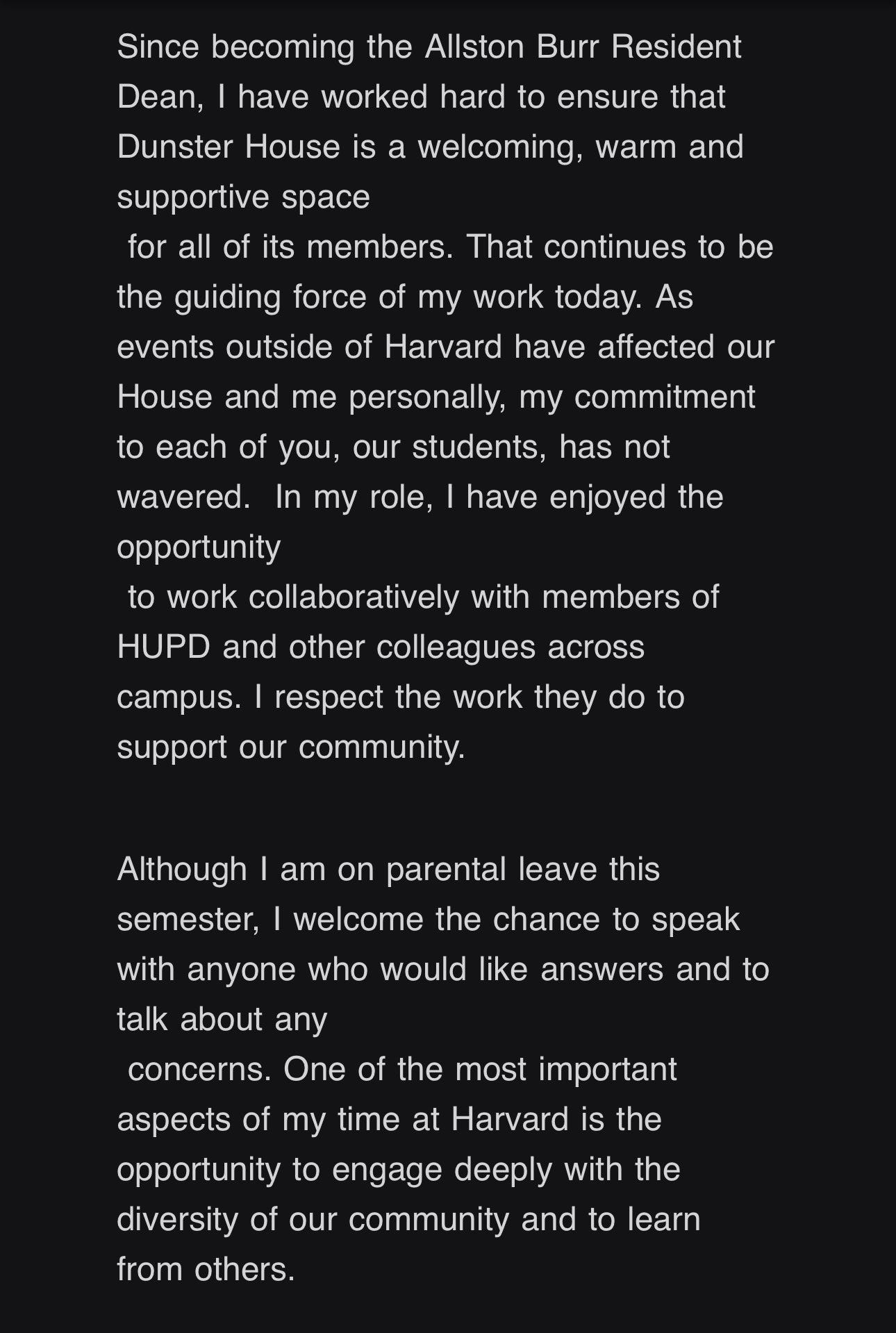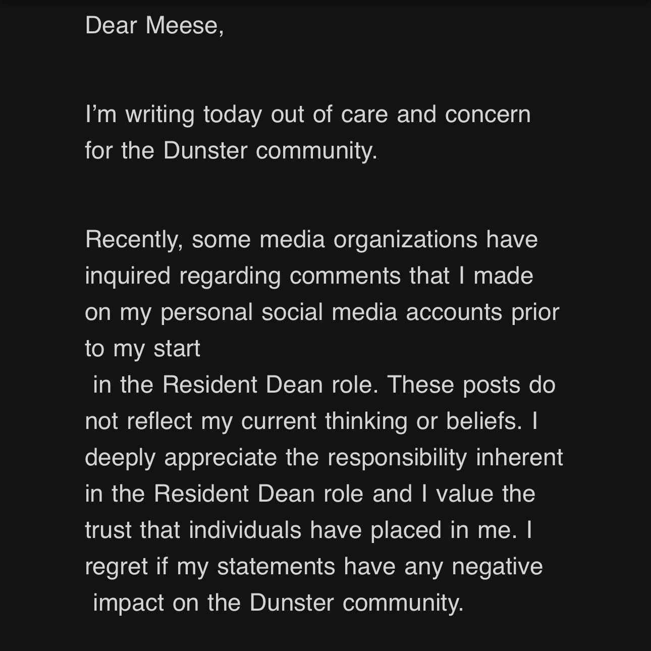 Davis opened his email asserting that his comments were “made on [his] social media prior to [his] start in the Resident Dean role.” This is the first of multiple falsehoods in Davis’s “apology.” In fact, perhaps the most egregious statement—an imploration to “hate the police”—was made while he was the Interim Resident Dean of Dunster House. This is not ancient history dug in from some forgotten teenage account. These were the public moral declarations of a man already entrusted with disciplinary authority over undergraduates.