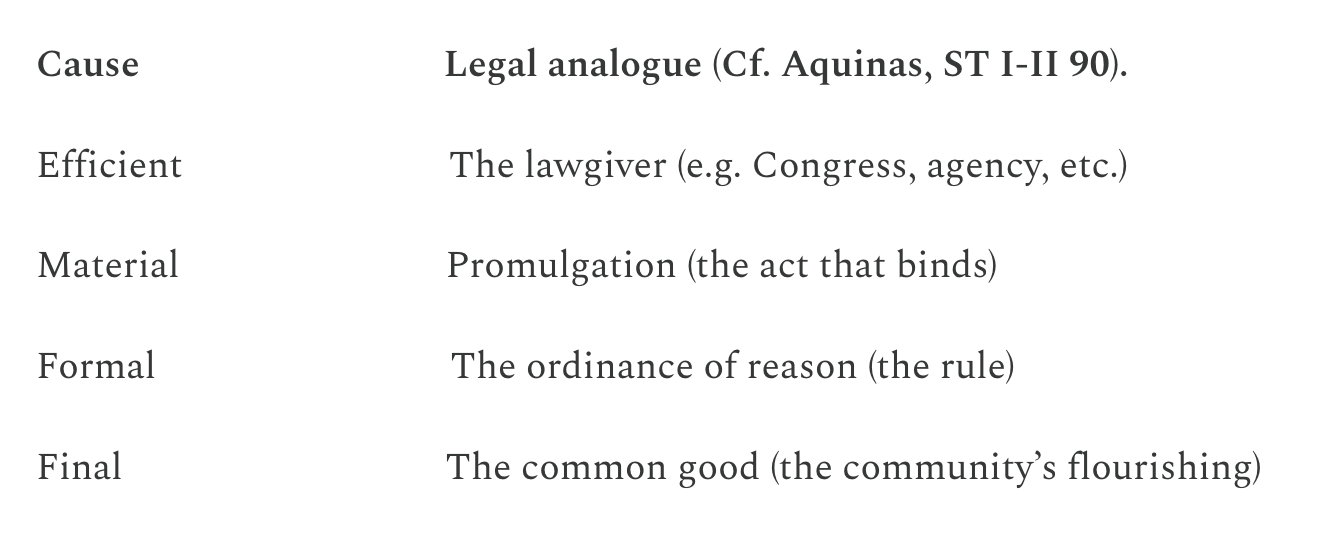 Strip away any cause and what remains is not fully lex. Natural-law jurisprudence therefore resists both pure voluntarism (the will of the sovereign is enough) and pure formalism (the words alone are enough). Text must be read in and through the background grammar of the common good, linked with promulgation, the lawgiver, and the ordinance of reason. That is, in the words of Vermeule: “[classical American] jurists did not explain the legality of moral principle by adverting to social facts, judicial choice, or more fundamental laws; on the contrary, they seemed to treat ‘moral laws’ as self-evident, unchangeable, and applicable ex proprio vigore [of their own force].”13